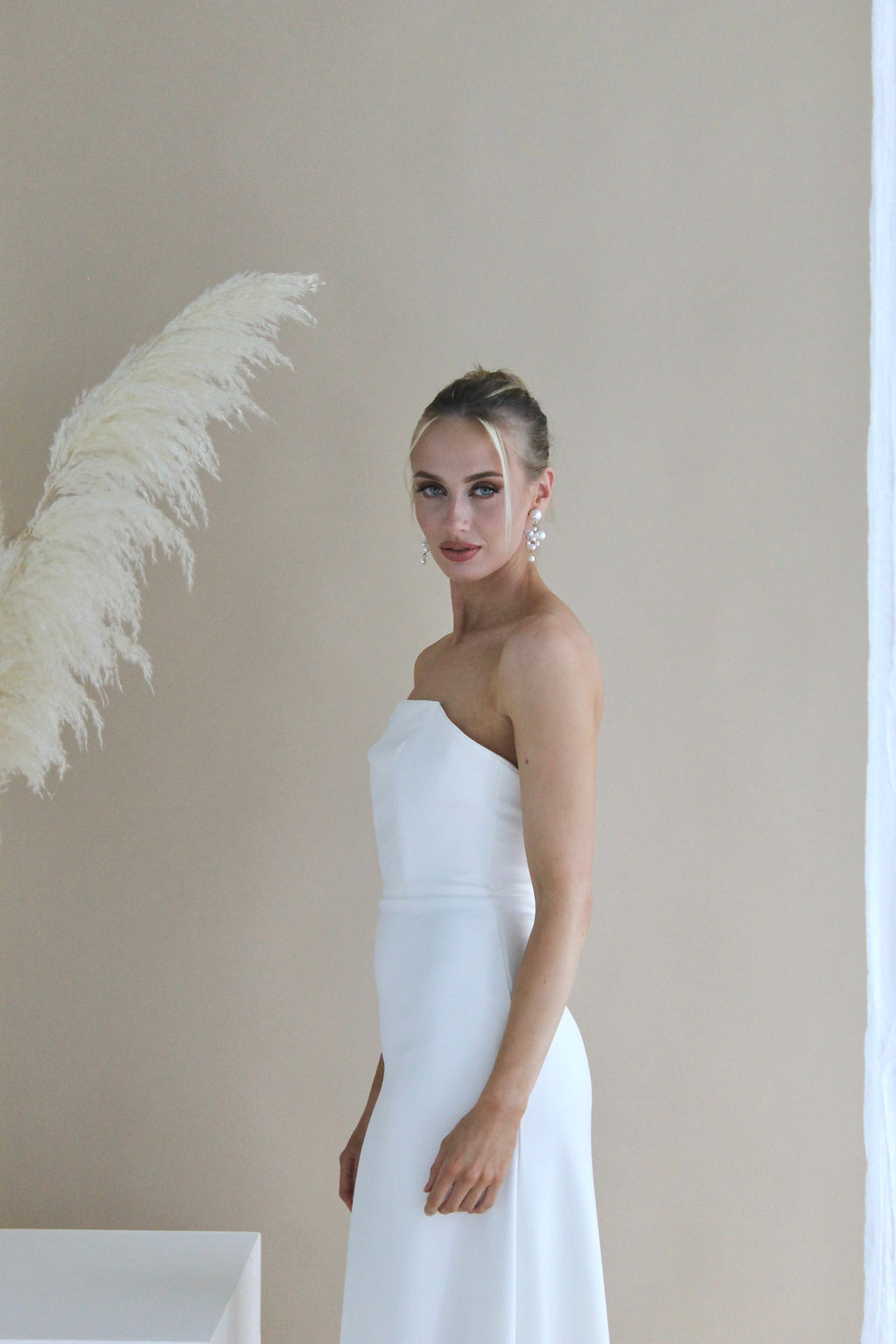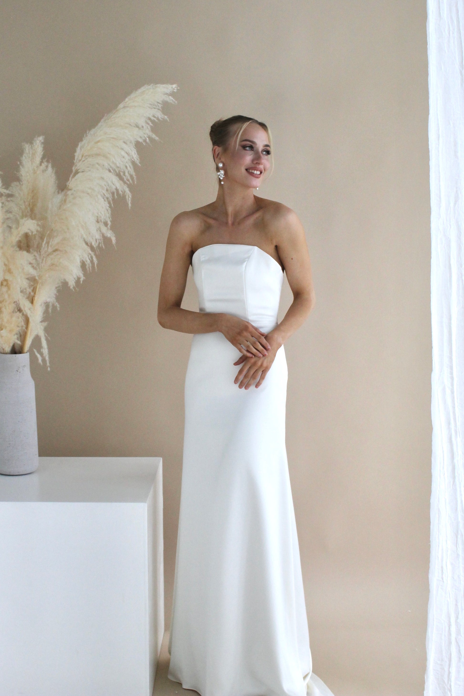 Introducing the Nina Wedding Dress, a modern, classic, and chic choice for the stylish bride. This strapless gown features a flattering fit-and-flare silhouette, seamlessly blending timeless elegance with contemporary style. Perfect for brides seeking an elegant and timeless wedding dress for their special day.
