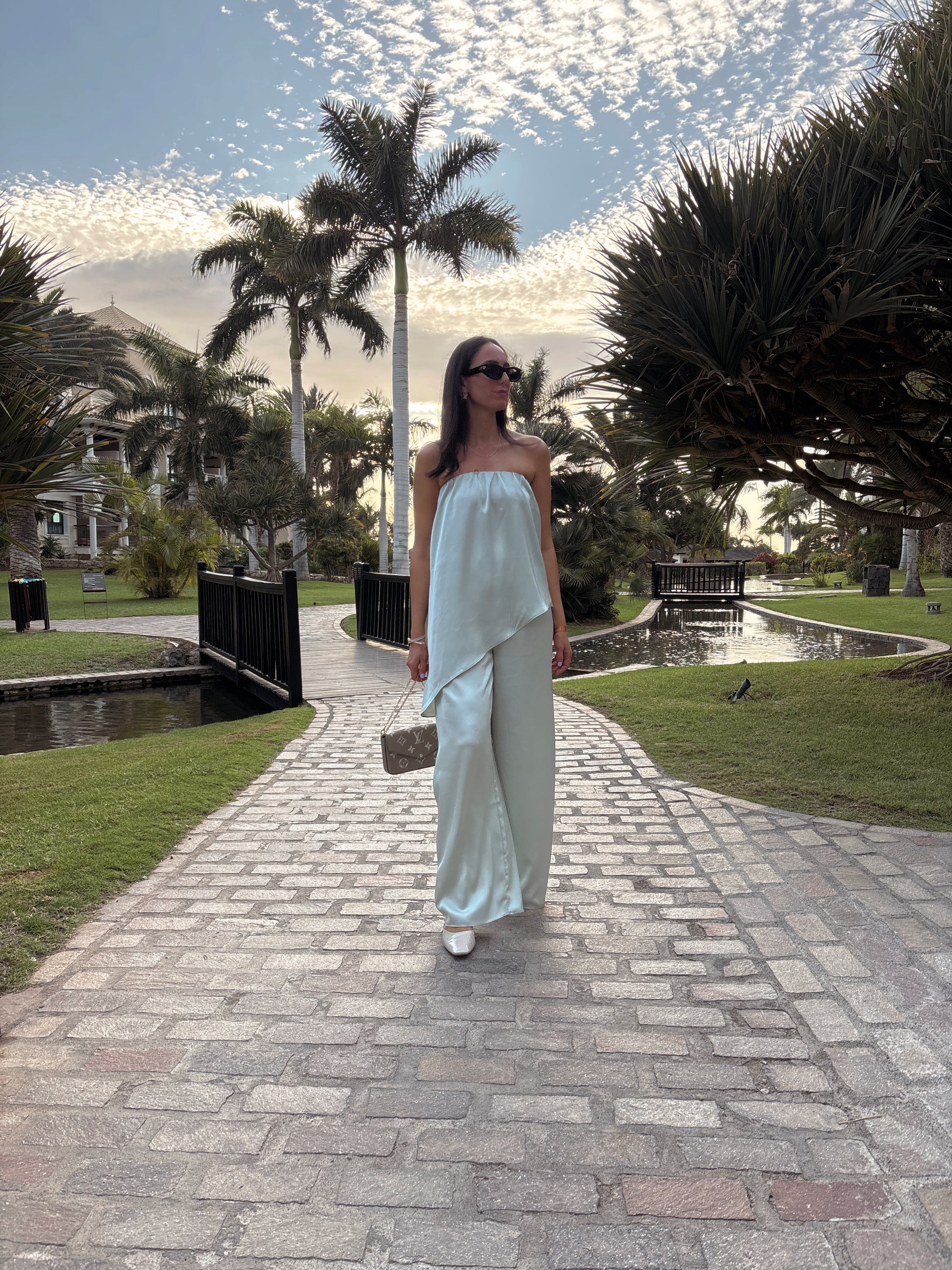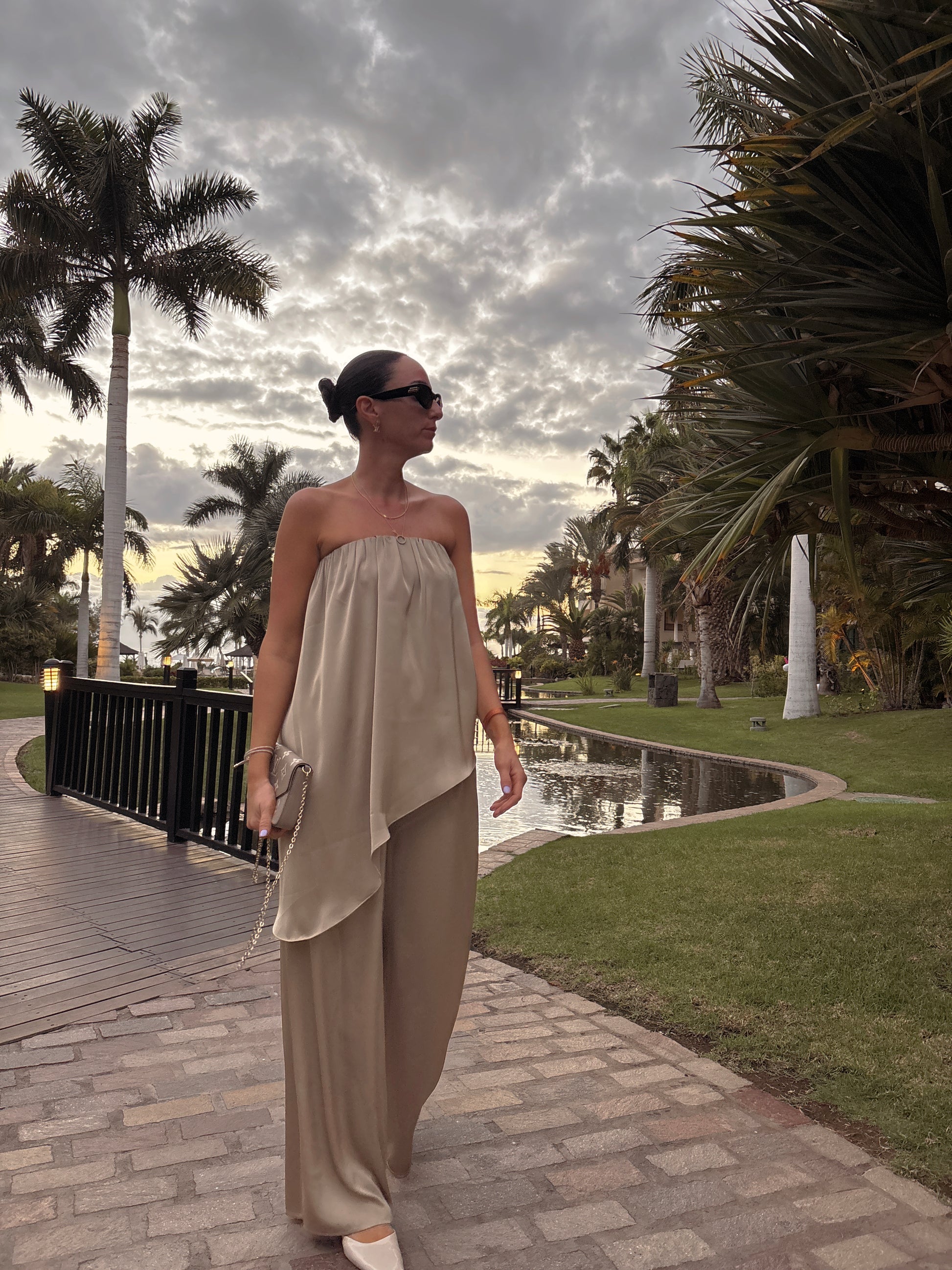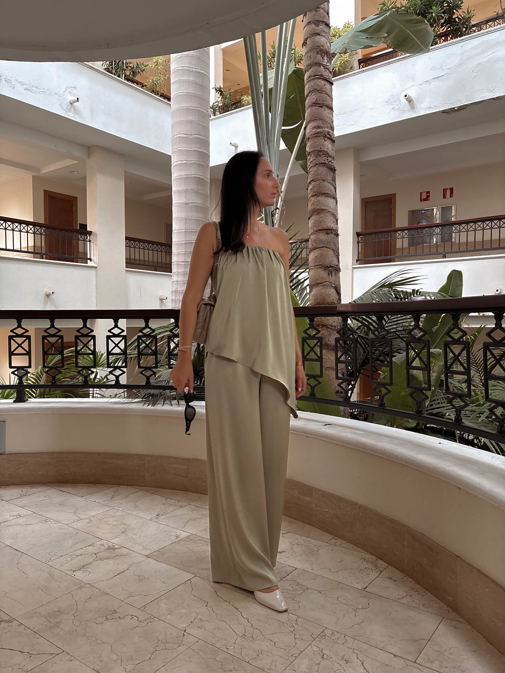 This flowing two-piece set features a strapless draped top with an asymmetric hem and wide-leg trousers for a relaxed yet refined silhouette. Designed from a soft, lightweight fabric, it moves beautifully with the body — the perfect versatile outfit for an everyday chic look, elegant dinners, or effortless resort style. Minimal, timeless, and irresistibly comfortable.