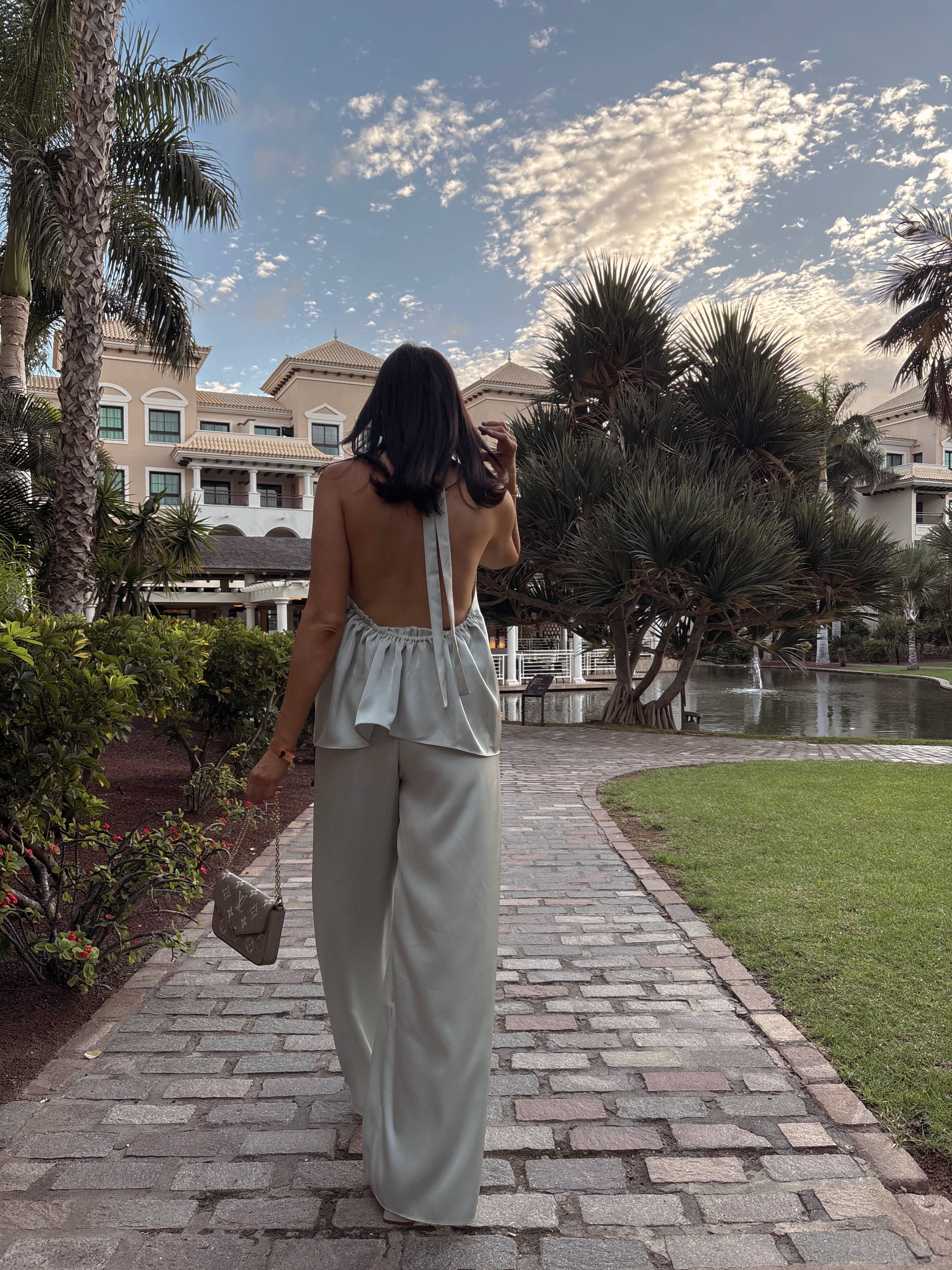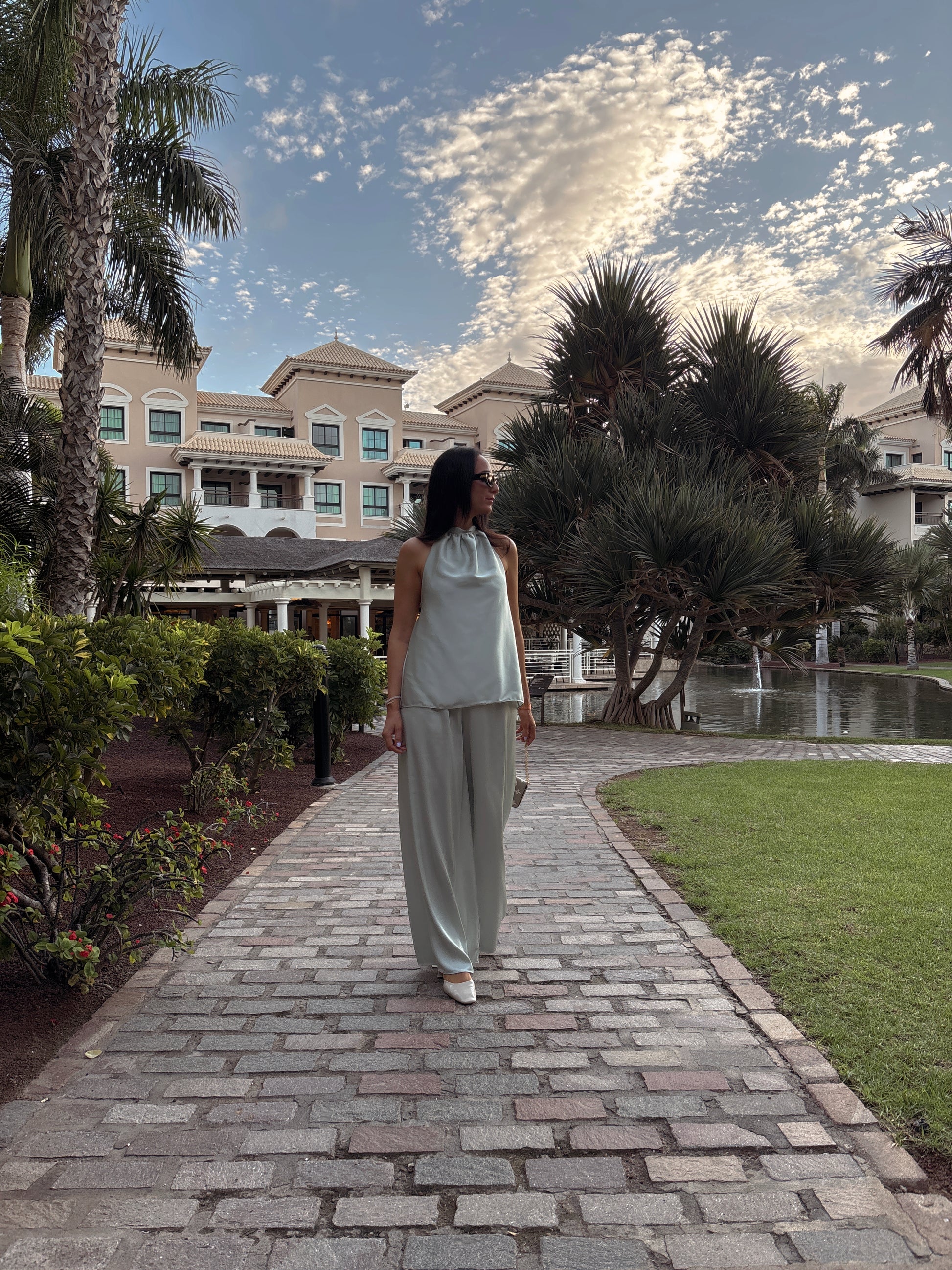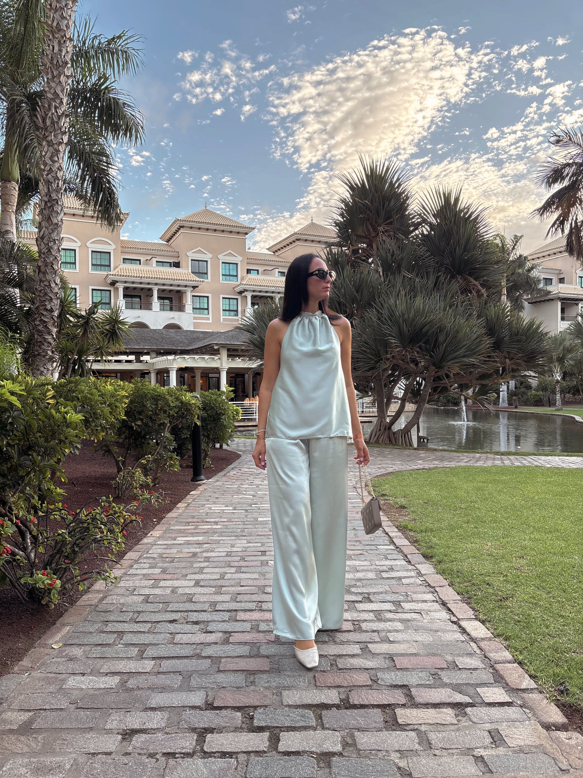 This flowing two-piece set features a halter draped top and wide-leg trousers for a relaxed yet refined silhouette. Designed from a soft, lightweight fabric, it moves beautifully with the body — the perfect versatile outfit for an everyday chic look, elegant dinners, or effortless resort style. Minimal, timeless, and irresistibly comfortable.