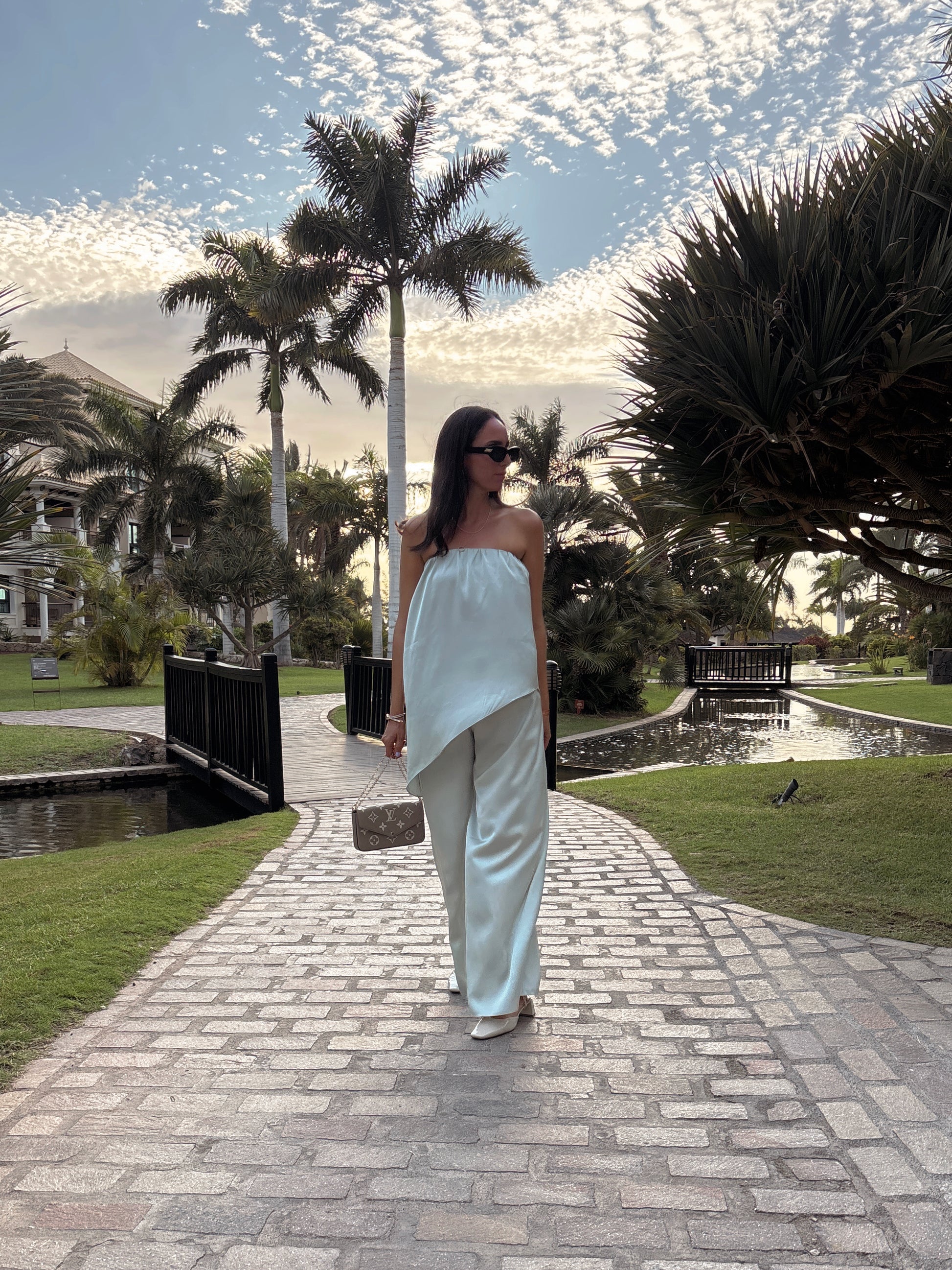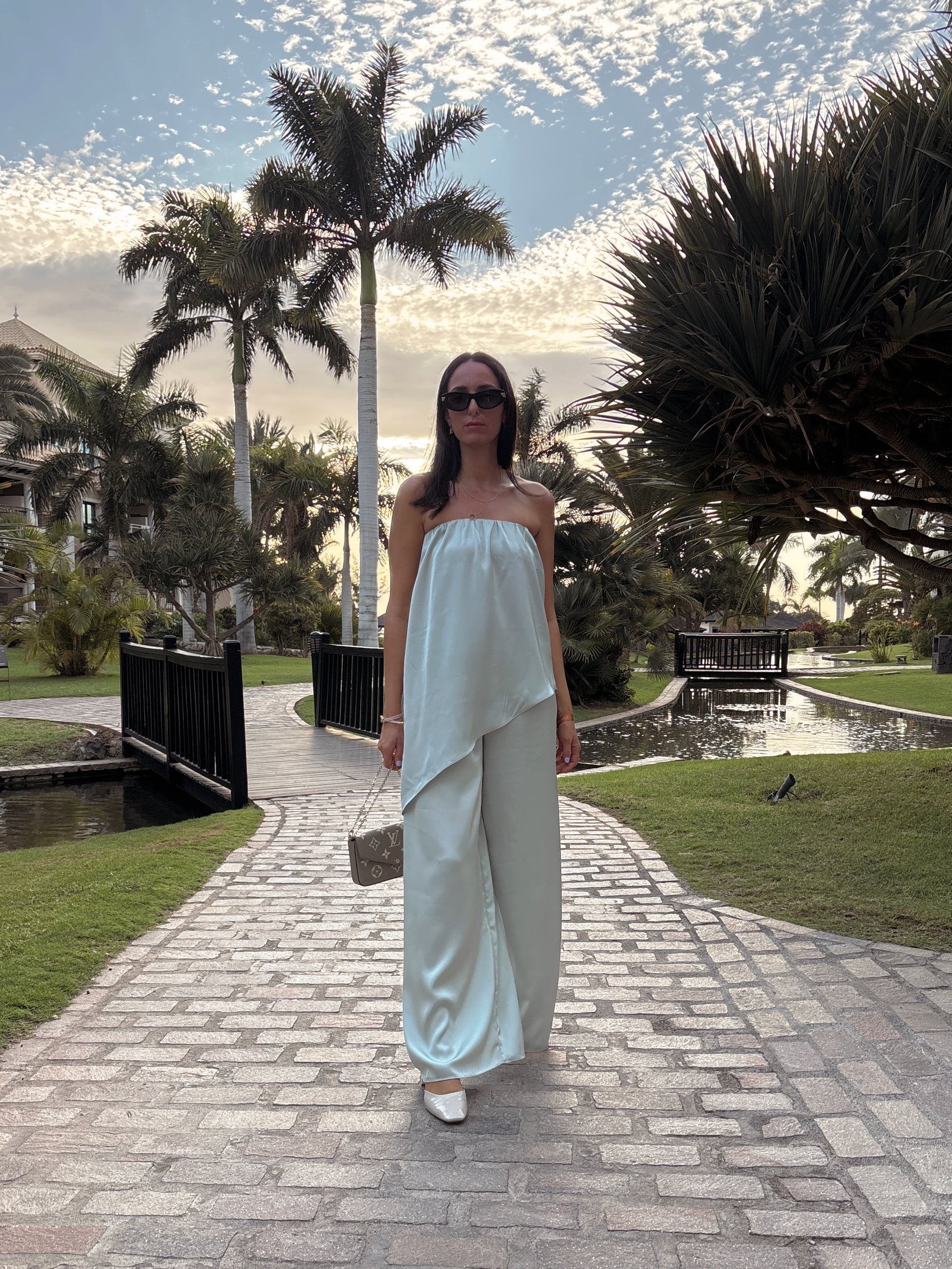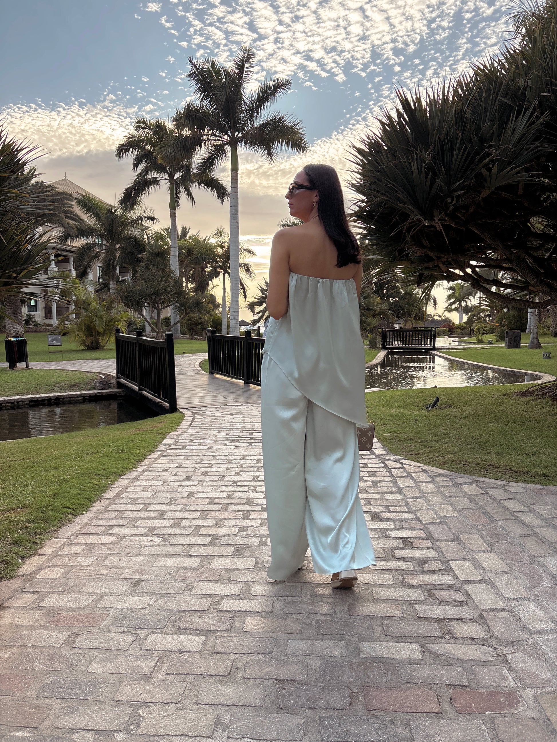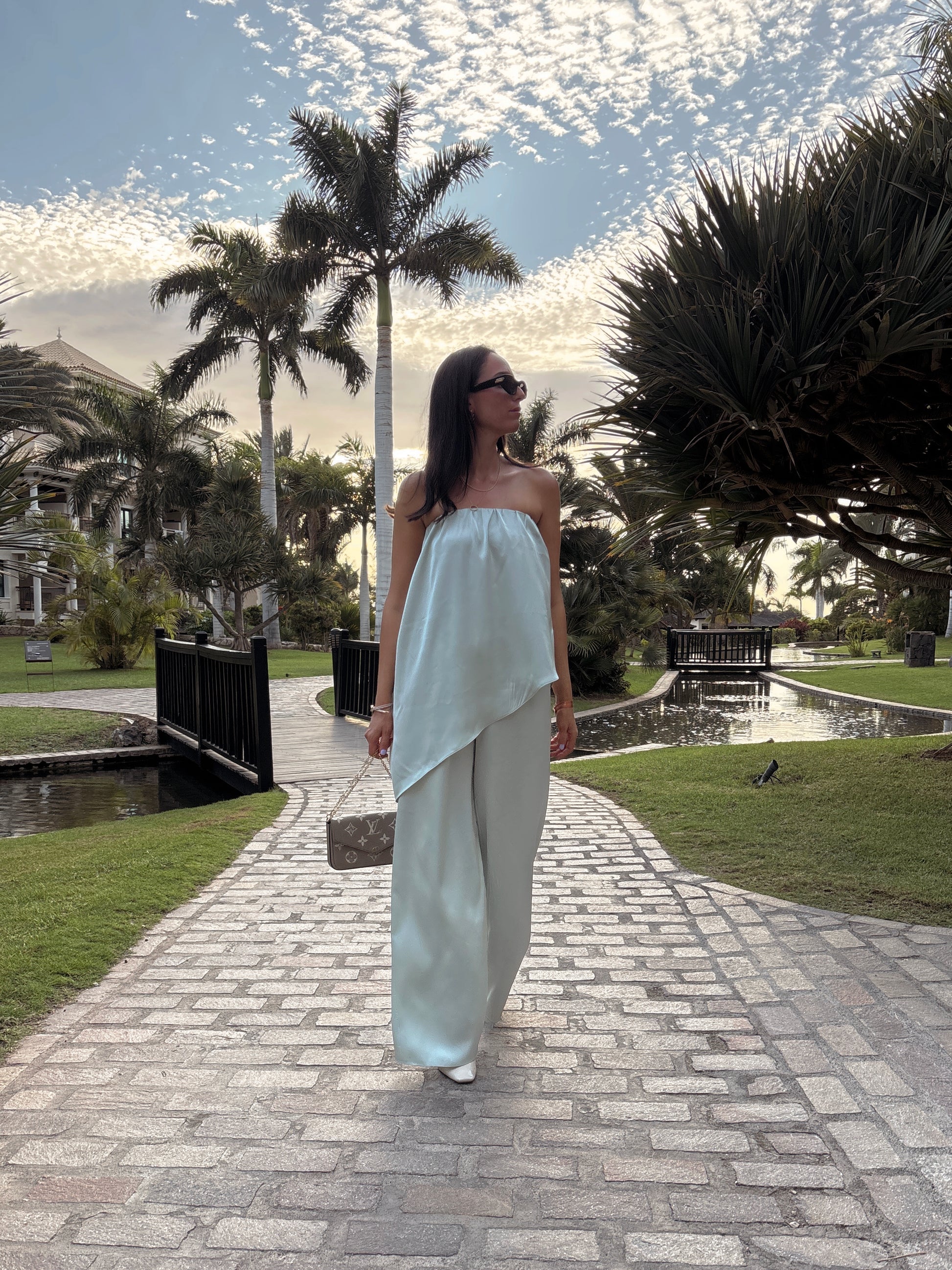 This flowing two-piece set features a strapless draped top with an asymmetric hem and wide-leg trousers for a relaxed yet refined silhouette. Designed from a soft, lightweight fabric, it moves beautifully with the body — the perfect versatile outfit for an everyday chic look, elegant dinners, or effortless resort style. Minimal, timeless, and irresistibly comfortable.