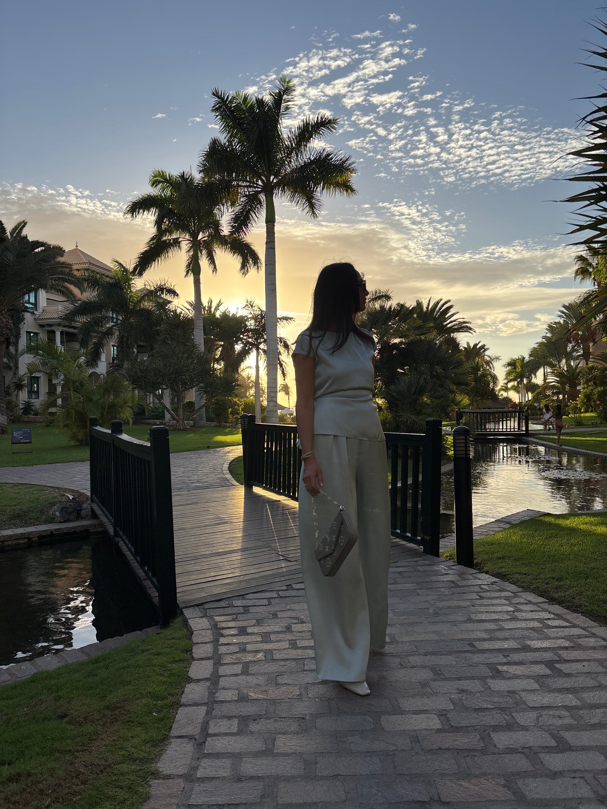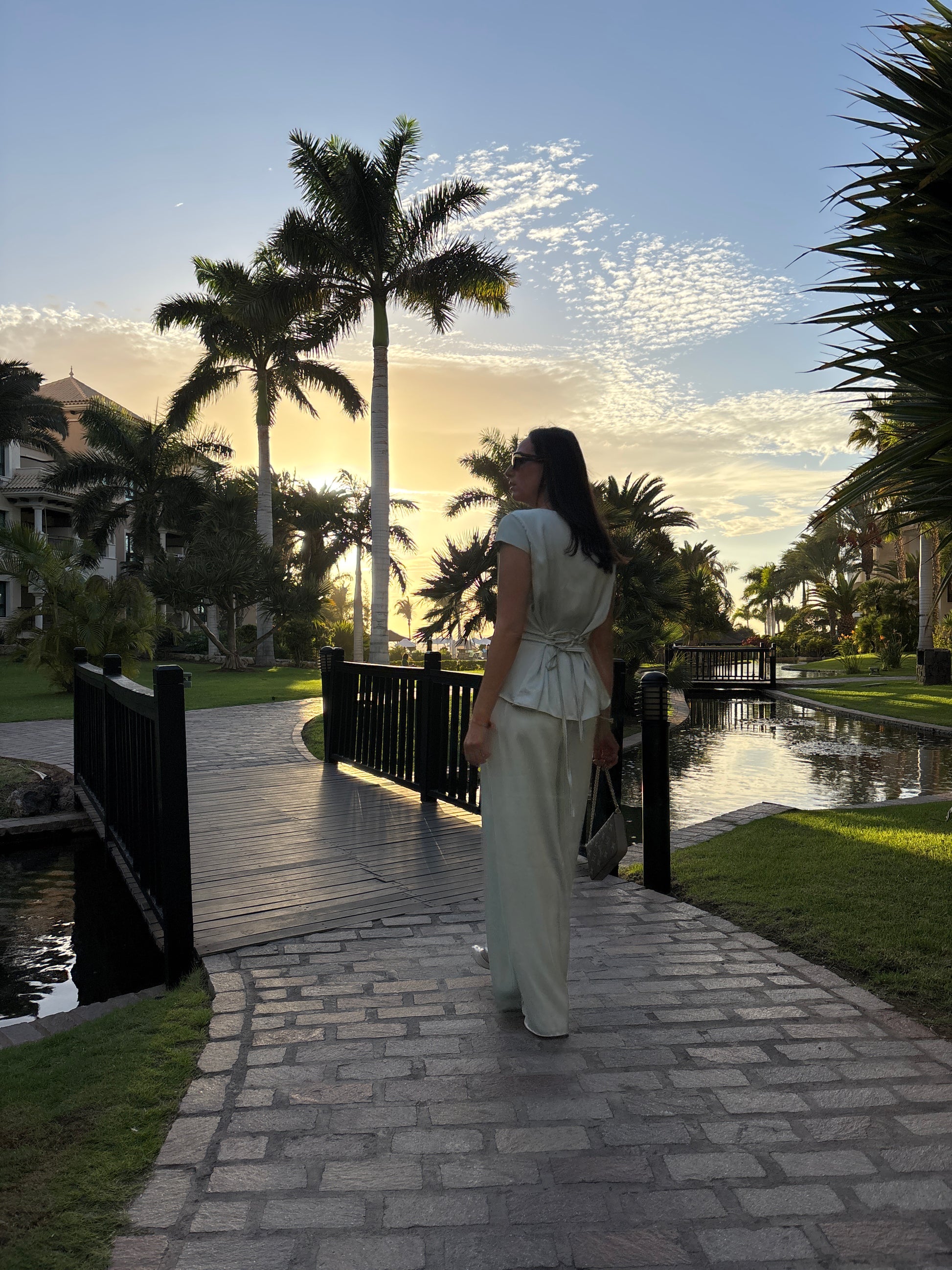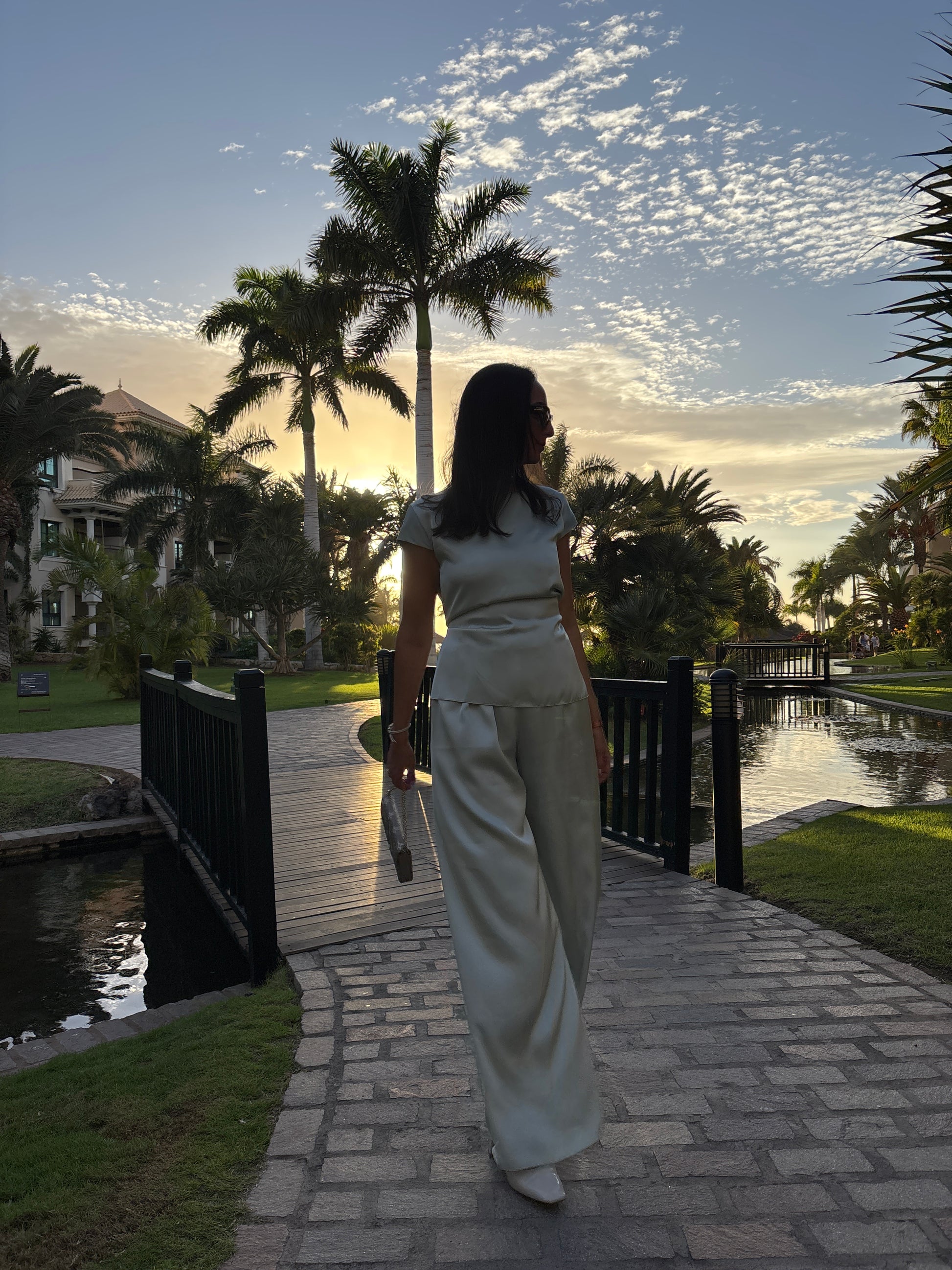 This flowing two-piece set features a cap-sleeve top with an adjustable waistline and wide-leg trousers for a relaxed yet refined silhouette. Designed from a soft, lightweight fabric, it moves beautifully with the body — the perfect versatile outfit for an everyday chic look, elegant dinners, or effortless resort style. Minimal, timeless, and irresistibly comfortable.