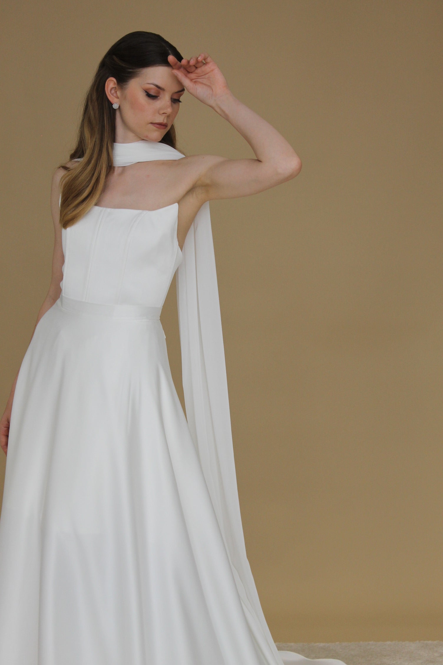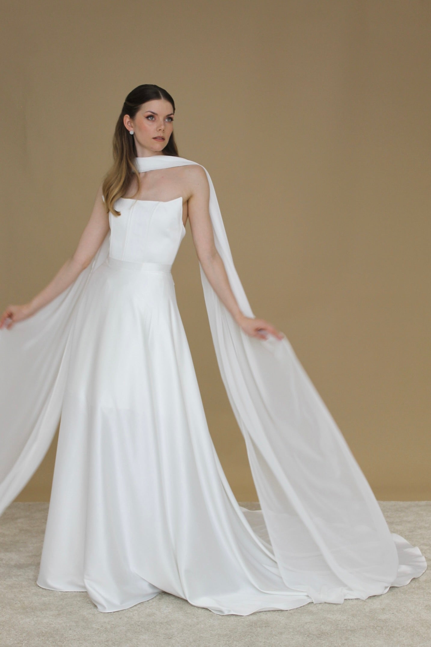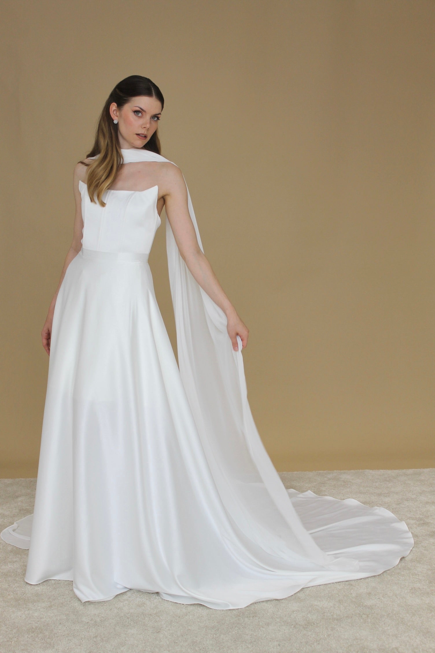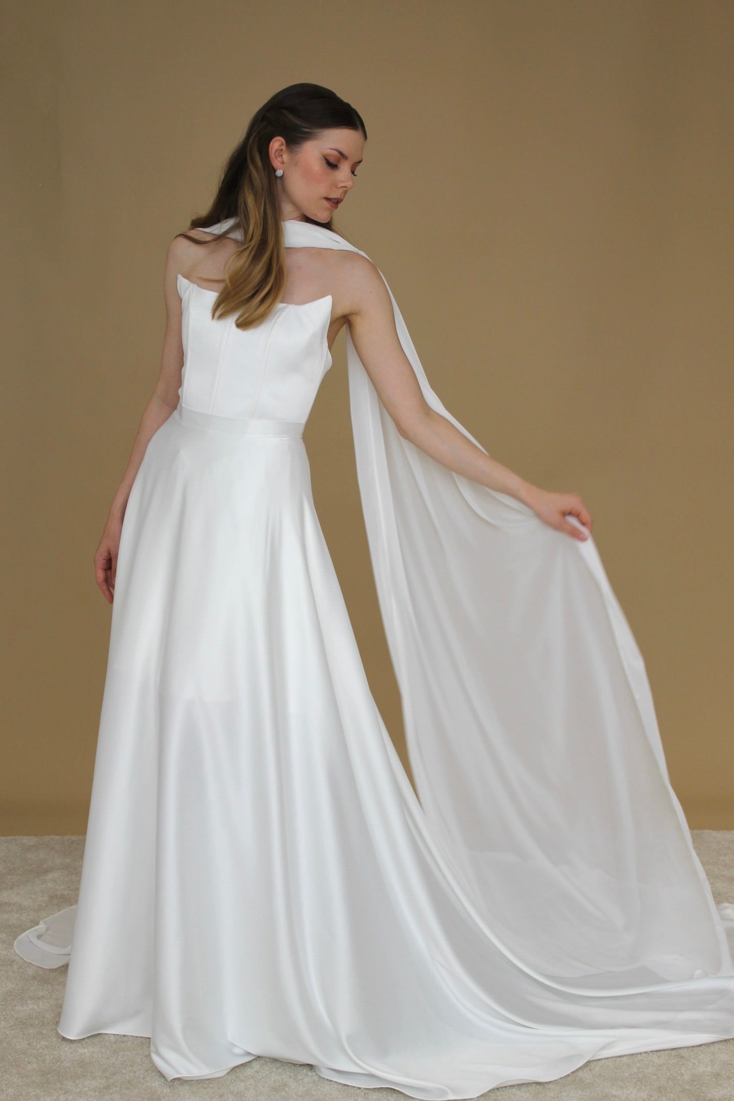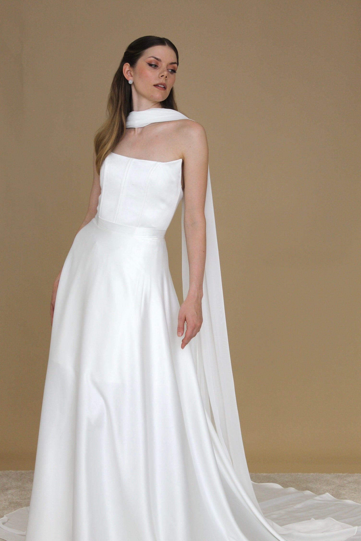 This strapless design features a structured corset bodice and a soft gathered skirt that moves effortlessly with every step. Crafted from luxurious ivory satin, the Selene gown brings together timeless structure and youthful energy — perfect for the bride who dares to be different.