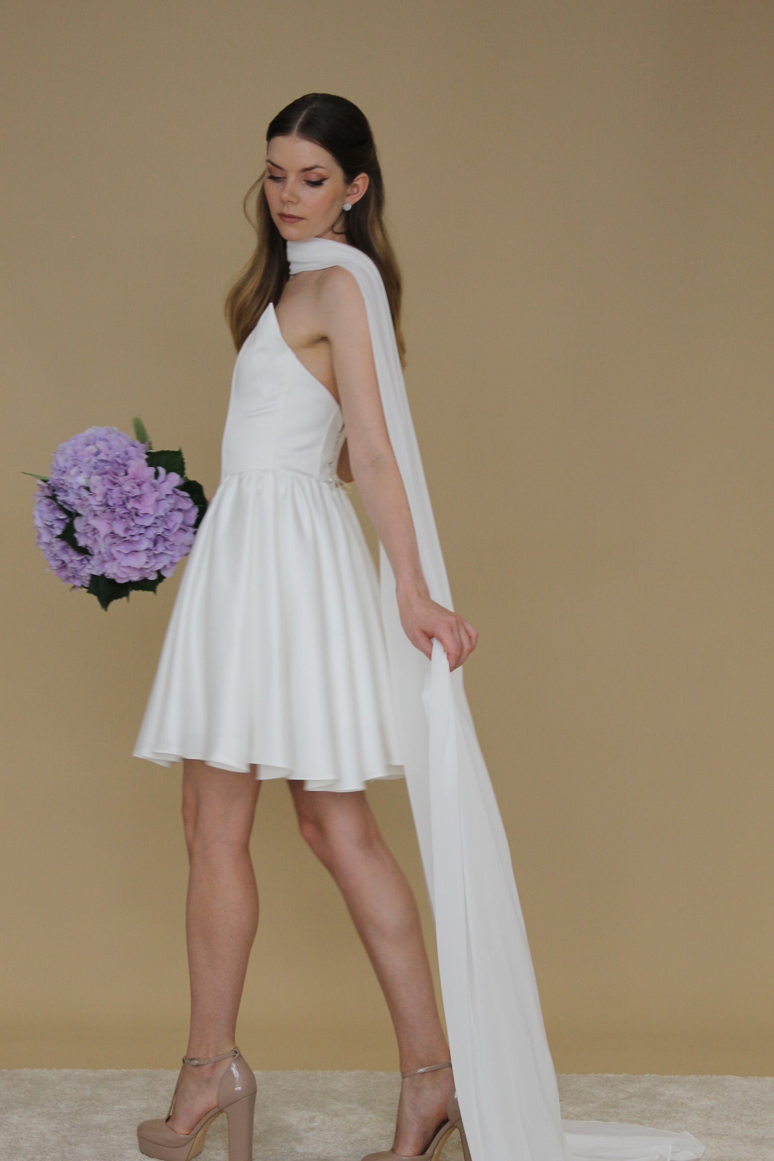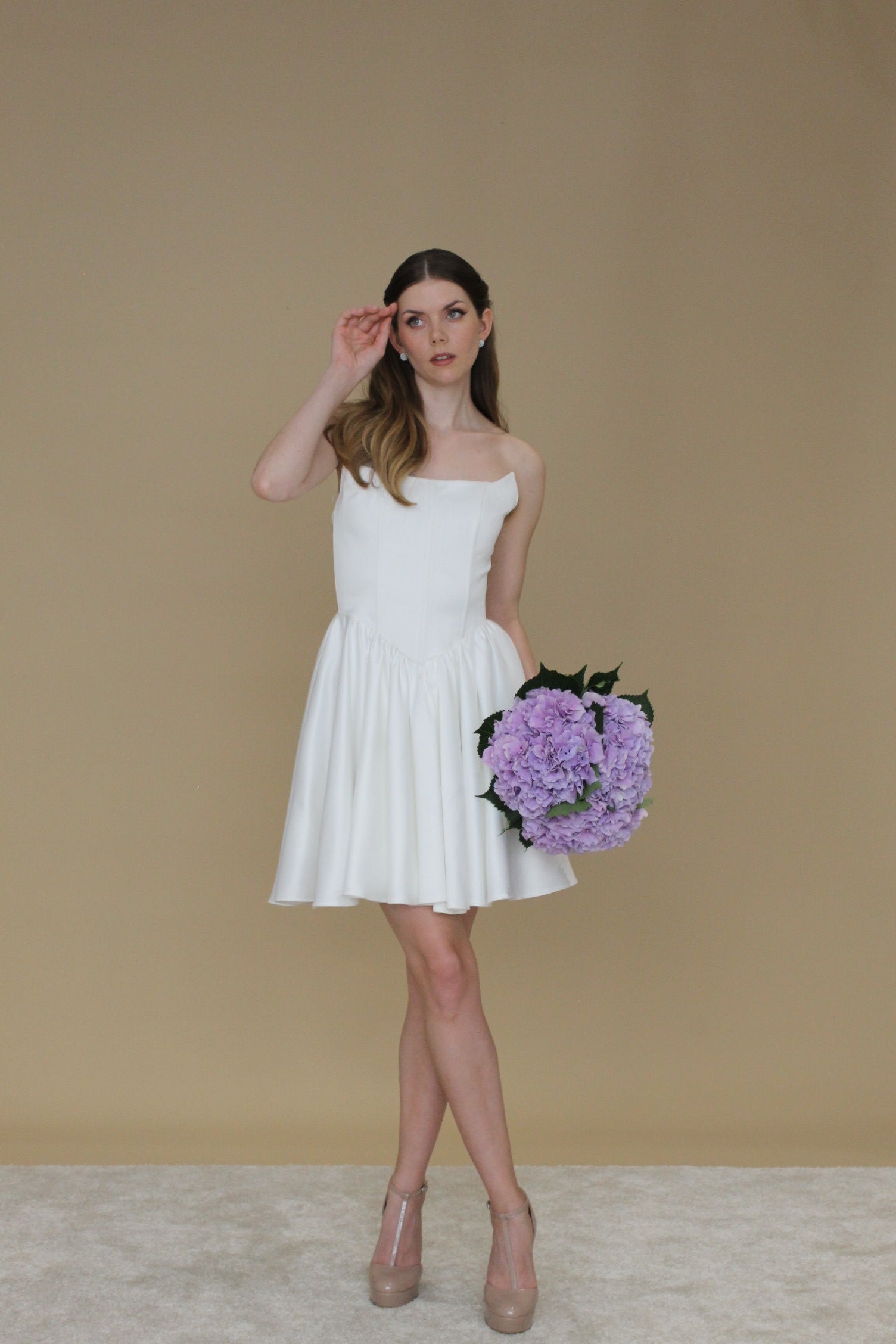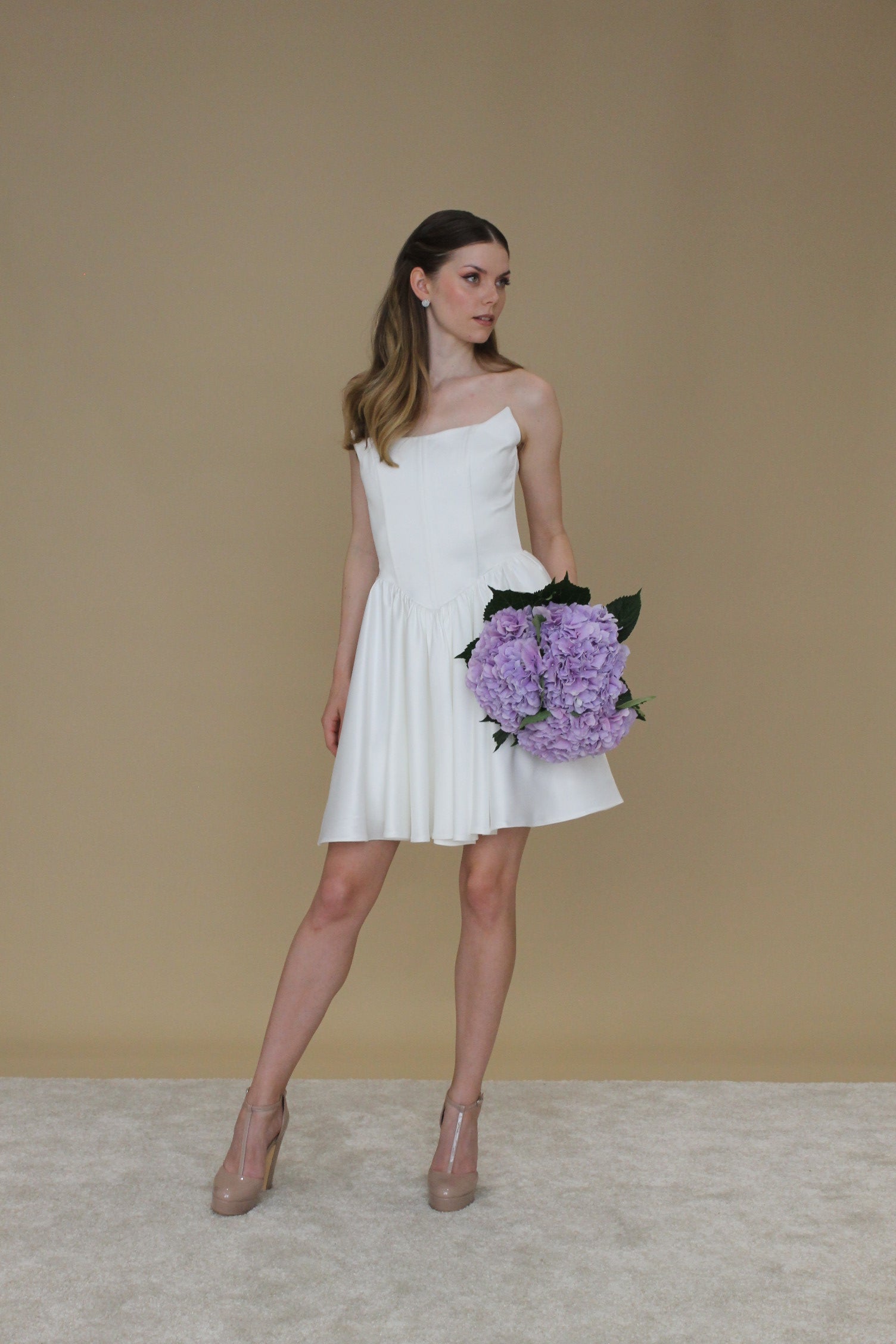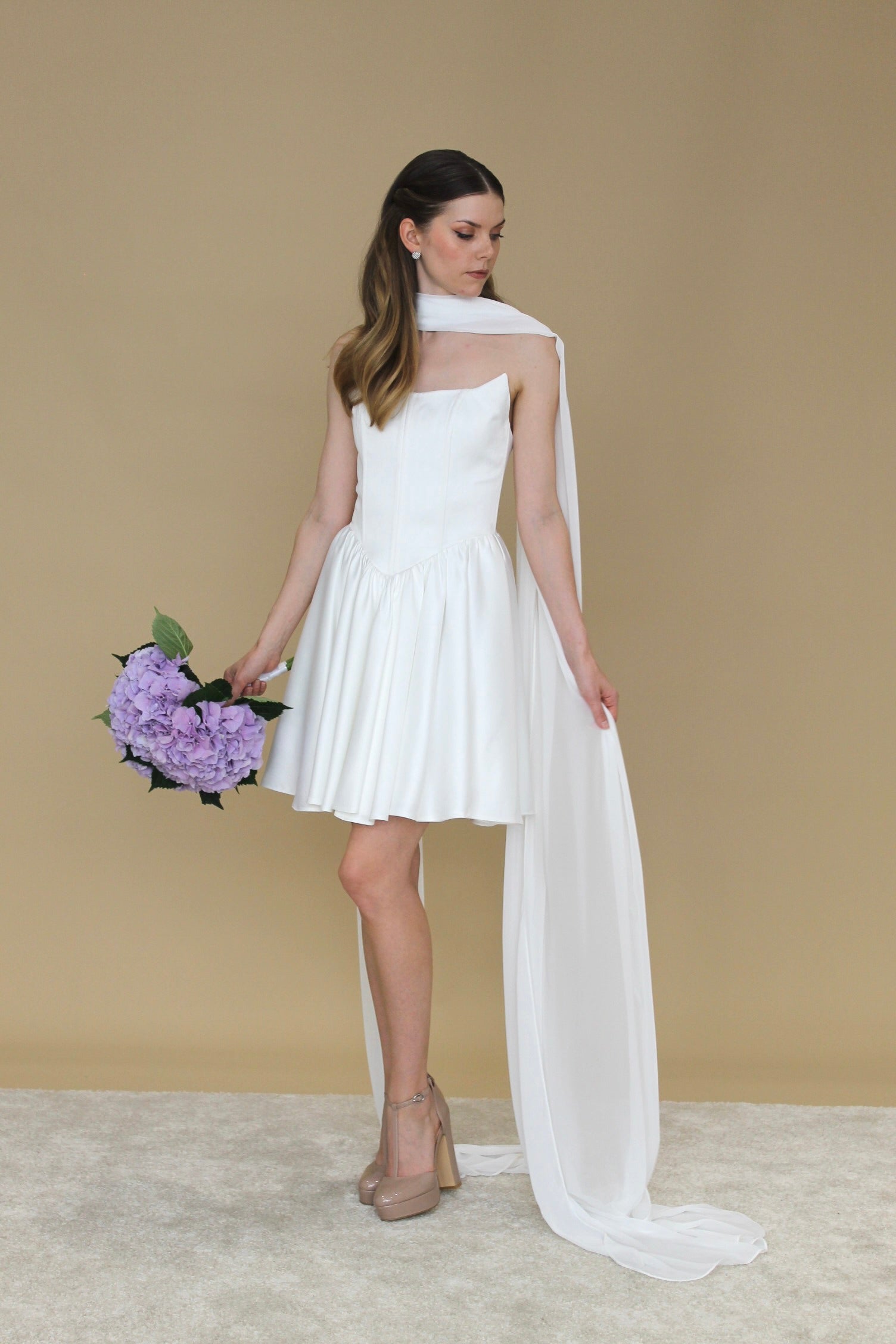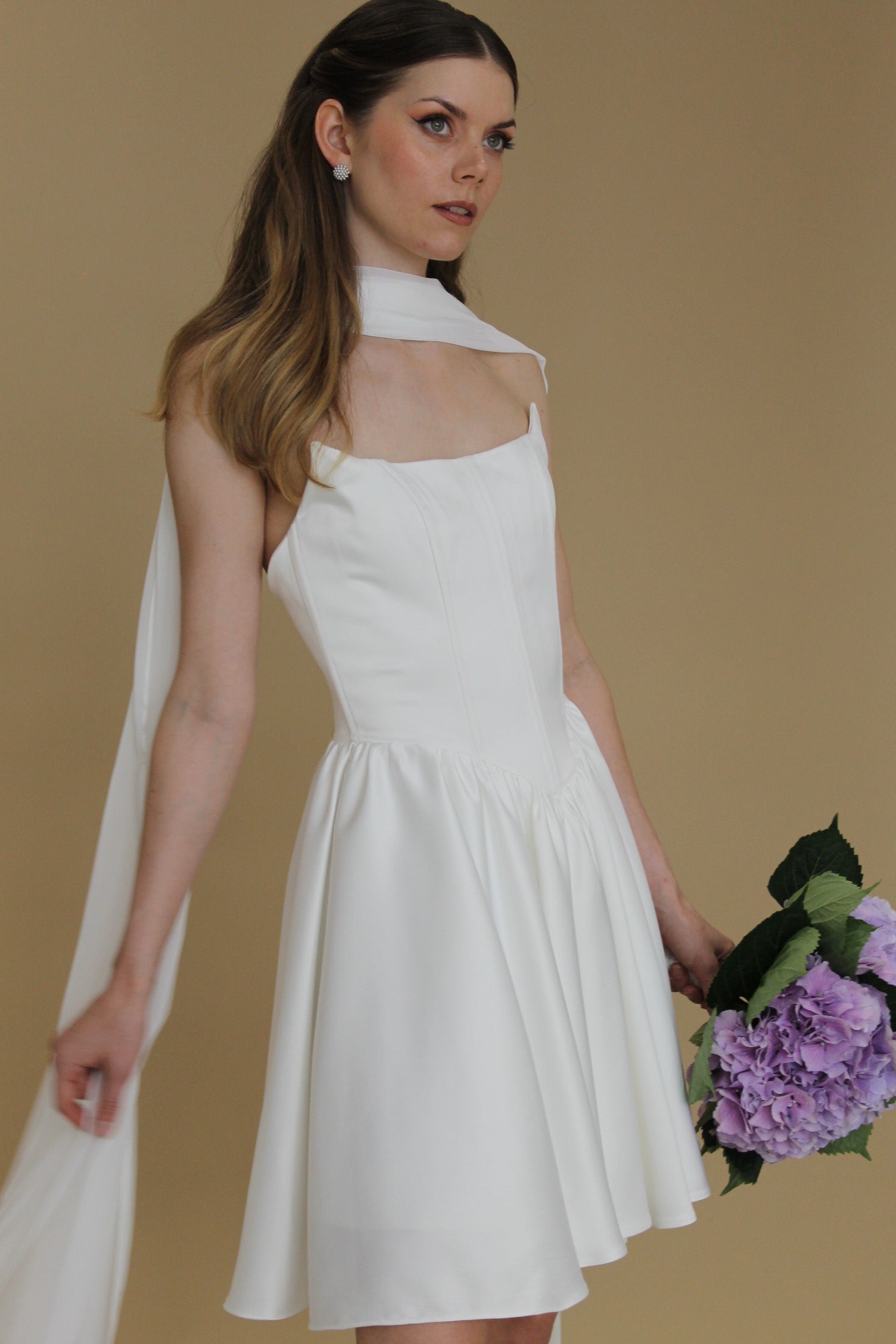 Introducing Selene – A playful yet sophisticated mini that redefines modern bridal style paired with a floor length A line over skirt for an unforgettable 2 looks wedding dress.