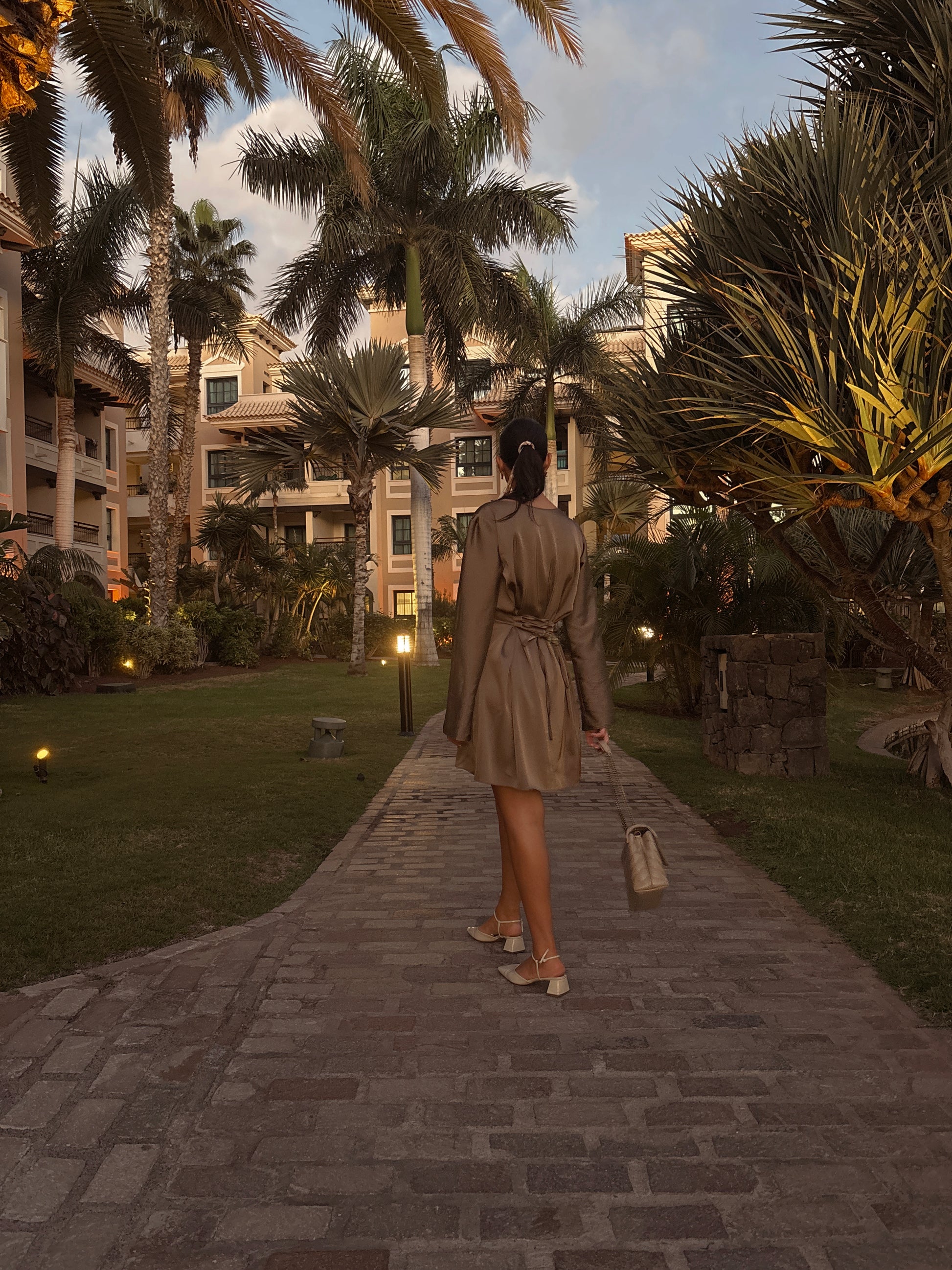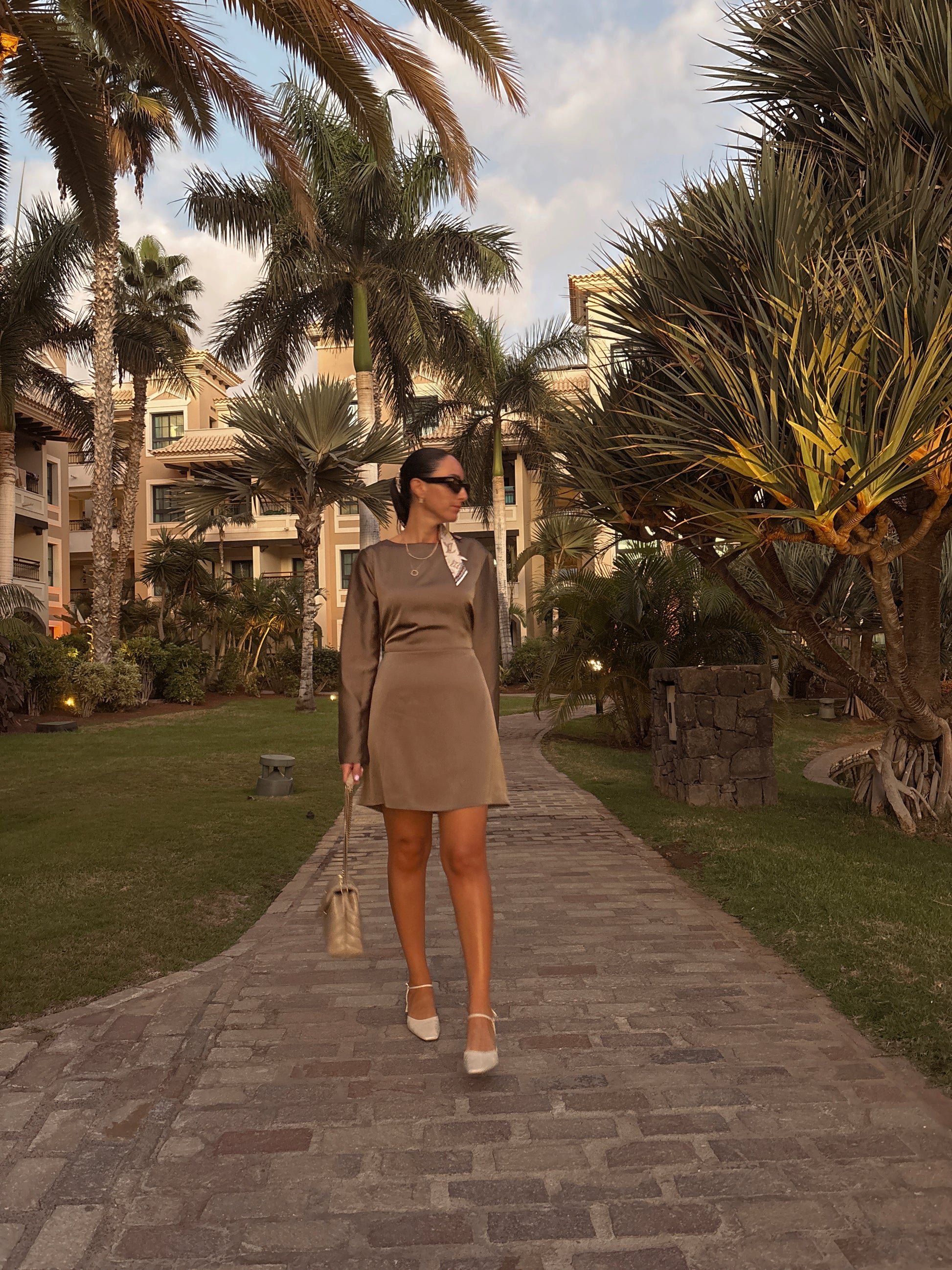 This flowing long-sleeve mini dress features a soft silhouette with an adjustable waistline for the perfect, flattering fit. Designed from a lightweight crepe fabric, it moves beautifully with the body — the perfect versatile outfit for an everyday chic look, elegant dinners, or effortless resort style. Minimal, timeless, and irresistibly comfortable.